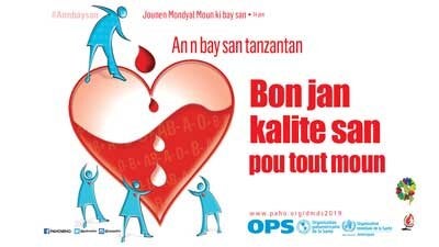 Banner monitors: Jounen Mondyal Moun ki bay san. Bon jan kalite san pou tout moun (JPG); 2019 (créole, crioulo)