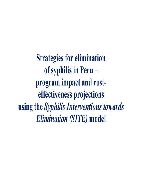 Control of syphilis is a key component of Peru’s national strategy and activities to control human immunodeficiency virus (HIV) and sexually transmitted infections (STIs). Compared to other countries in the Region of the Americas, Peru has a relatively low prevalence of syphilis in pregnant women, and this fell from 2012 to 2016 – whereas the prevalence in the Region increased. Syphilis Interventions Towards Transmission (SITE) is a new tool developed by Avenir Health with support from the Pan American Health Organization. SITE simulates adult syphilis transmission in a country and can be used to look at the impact and cost-effectiveness of different STI control programs and interventions, guiding countries toward syphilis elimination targets. The model has been piloted in Peru to identify opportunities for optimizing the country’s STI and syphilis control strategy, plan, targets, and cost estimates. This report presents a compilation of syphilis epidemiological and programmatic data, the model calibration based...
