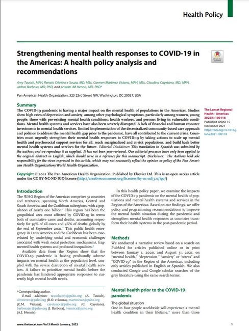 The COVID-19 pandemic is having a major impact on the mental health of populations in the Americas. Studies show high rates of depression and anxiety, among other psychological symptoms, particularly among women, young people, those with pre-existing mental health conditions, health workers, and persons living in vulnerable conditions. Mental health systems and services have also been severely disrupted. A lack of financial and human resource investments in mental health services, limited implementation of the decentralized community-based care approach and policies to address the mental health gap prior to the pandemic, have all contributed to the current crisis. Countries must urgently strengthen their mental health responses to COVID-19 by taking actions to scale up mental health and psychosocial support services for all, reach marginalized and at-risk populations, and build back better mental health systems and services for the future.