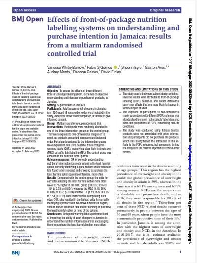 Objective To assess the effects of three different front-of-package labelling (FOPL) schemes on objective understanding and intention to purchase of products, in Jamaica.