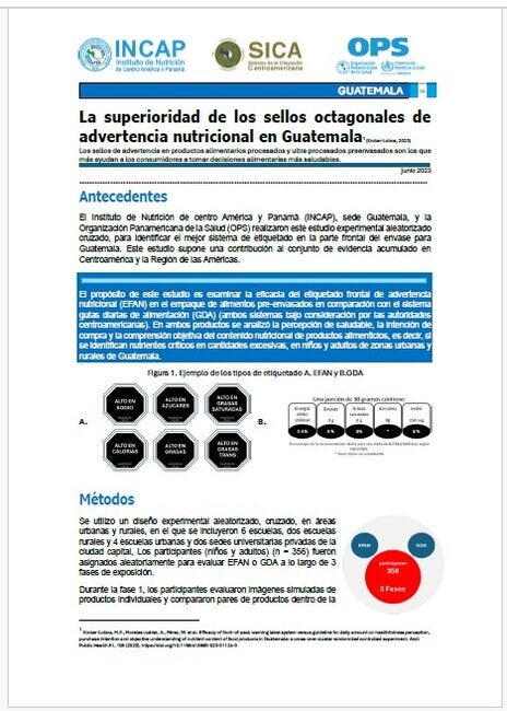 PresentaciónEl Instituto de Nutrición de centro América y Panamá (INCAP), sede Guatemala, y la Organización Panamericana de la Salud (OPS) realizaron este estudio experimental aleatorizado cruzado, para identificar el mejor sistema de etiquetado en la parte frontal del envase para Guatemala. Este estudio supone una contribución al conjunto de evidencia acumulado en Centroamérica y la Región de las Américas. Los resultados del presente estudio indican que los individuos expuestos al sistema EFAN mejoraron su comprensión objetiva sobre la presencia de cantidades excesivas de nutrientes críticos relacionados con las ENT en los productos. La exposición a EFAN también disminuyó la intención de compra de productos con cantidades excesivas de estos nutrientes y mejoró su percepción errónea sobre “que tan saludable” son los productos al evaluar productos individuales y en pares, en comparación con GDA. El efecto se mantuvo en niños, adultos y aun cuando las personas tenían un bajo nivel educativo o viven en áreas rurales. Por el contrario, el sistema GDA fue ineficaz para mejorar la comprensión de los consumidores sobre el contenido de nutrientes de los productos, su percepción errónea sobre “que tan saludable” son los productos y su intención de comprar opciones más saludables. Según nuestros hallazgos, el sistema EFAN debería adoptarse como parte de una política pública de alimentación saludable en Guatemala. Su adopción como política alimentaria brinda a Guatemala, y a los países centroamericanos, la mejor oportunidad para cumplir efectivamente el propósito de permitir a los consumidores identificar fácilmente productos con exceso de azúcares, sodio, grasas, grasas saturadas y grasas trans, y tomar decisiones de compra de alimentos más saludables. |