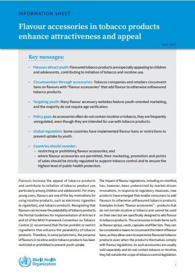 OverviewFlavours in tobacco, nicotine and related products enhance attractiveness and appeal, contributing to experimentation, initiation and sustained tobacco and nicotine use. Flavours are especially appealing to children and adolescents and in some jurisdictions, the presence of flavours in nicotine and/or tobacco products has been prohibited or restricted to prevent youth uptake. However, in response to such regulatory measures, new products, such as “flavour accessories”, have emerged that enable consumers to add flavours to otherwise unflavoured tobacco products, facilitating access to and continued use of flavoured products. Many flavour accessory websites feature youth-oriented marketing, and the majority do not require age verification. Flavour accessories pose challenges to regulators, as these products circumvent bans on flavours, and are frequently unregulated. This information sheet ‘Flavour accessories in tobacco products enhance attractiveness and appeal’ summarizes current knowledge on flavour accessories in tobacco products to a wide range of audiences, with a focus on regulators, to guide policy action to protect evidence-based policies. |
