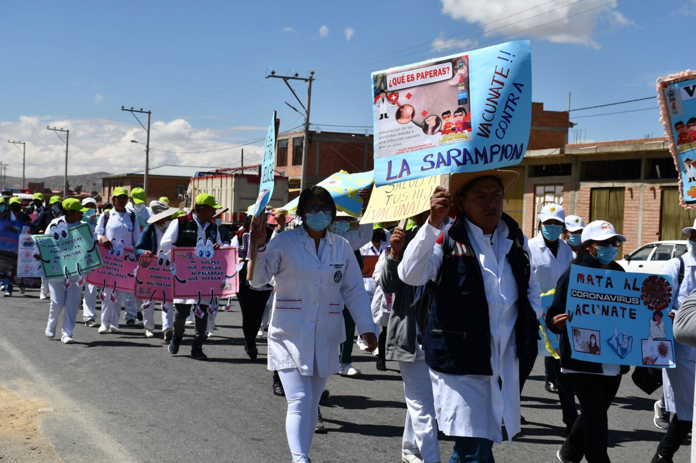 The outreach included performances with creative props such as walking syringes, performed to much laughter. The plays were held in Aymara, the local Indigenous language, as well as Spanish. Typical songs of the Andean region known as “tarqueadas” played with a wooden flute, called for men and women to get the vaccine, repeating their safety and life-saving quality with every drumbeat.