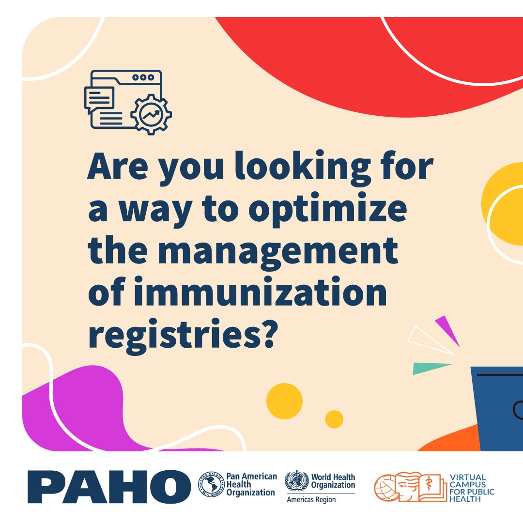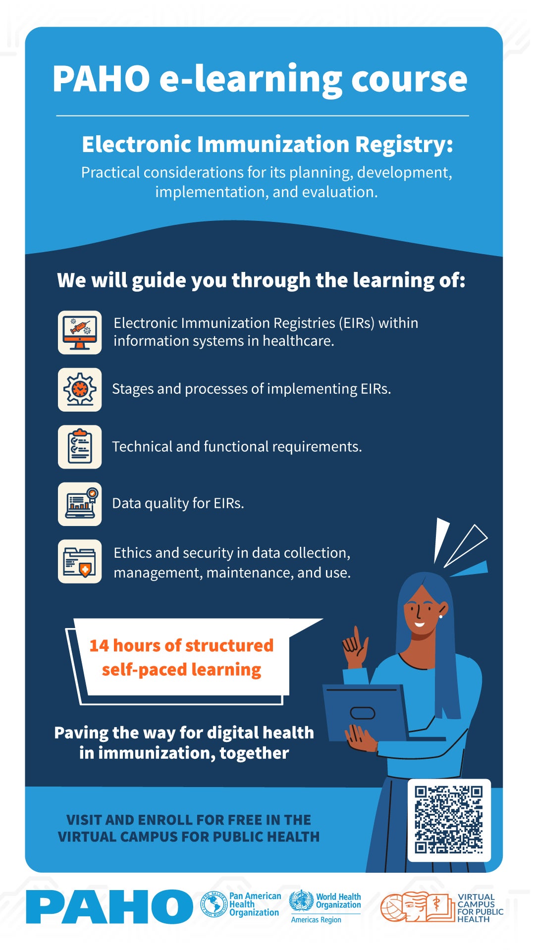 Dear Colleague, We are pleased to present the free, online, PAHO-certified training program to update knowledge on electronic Immunization Registry. The course consists of 4 modules, with an estimated time of 14 hours, ranging from the context and strategic planning of EIRs to their monitoring, evaluation and ethical considerations, providing key tools for their effective implementation and management. This course is aimed at health professionals, administrative staff and data managers in immunization programs, health authorities and other actors involved in the management, analysis and monitoring of immunization coverage and public health interventions based on information systems. Find out more and register in: https://www.paho.org/en/topics/immunization/immunization-toolkit/paho-c… |