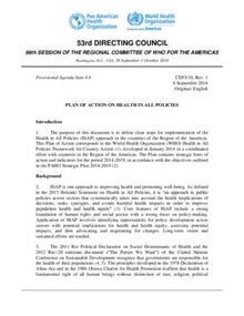 Health in All Policies (HiAP) is an approach to policymaking that systematically considers the health implications of decisions across sectors, seeking synergies and avoiding harmful health effects of policies outside the health sector in order to improve both population health and health equity. In line with the principles of Alma Ata, the Ottawa Charter, the Final Report of the Commission on the Social Determinants of Health, and the Rio Political Declaration on the Social Determinants of Health, Health in All Policies is a collaborative approach that aims to improve health by incorporating a health lens into decision-making across sectors and policy areas. It also builds the capacity of health policy professionals to recognize and support the development goals of other sectors, recognizing the interdependent nature of social, economic and environmental development.