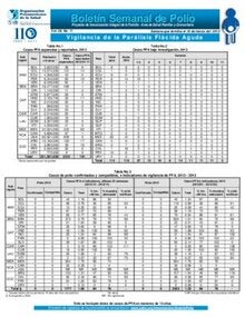 El Boletín de Polio ofrece información sobre los casos de parálisis flácida aguda (PFA), el número de casos notificados por país, su situación de laboratorio y los diagnósticos finales (desde 1986). Además, en el boletín se monitorea y publica la atención que los países prestan a los indicadores de vigilancia de la PFA. El Boletín de Polio se prepara a partir de los reportes semanales enviados por los países. Visite el sitio de poliomielitis para más información.  Suscribirse aquí