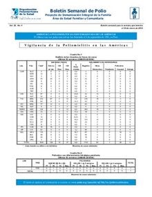 El Boletín de Polio ofrece información sobre los casos de parálisis flácida aguda (PFA), el número de casos notificados por país, su situación de laboratorio y los diagnósticos finales (desde 1986). Además, en el boletín se monitorea y publica la atención que los países prestan a los indicadores de vigilancia de la PFA. El Boletín de Polio se prepara a partir de los reportes semanales enviados por los países. Visite el sitio de poliomielitis para más información. Suscribirse aquí