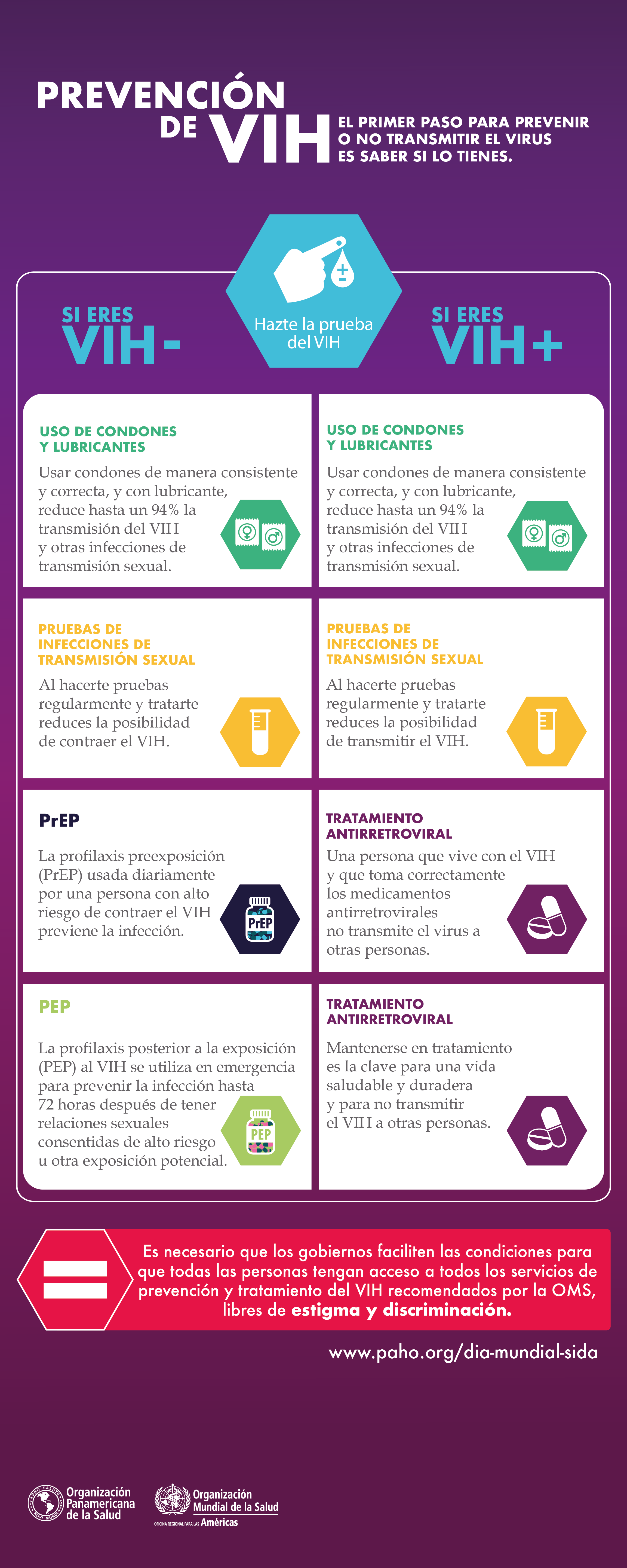 En la región de las Américas, se ha avanzado mucho en la respuesta al sida. A pesar de ello, se deben continuar con los esfuerzos para reducir los nuevos casos y mejorar el acceso al tratamiento. En América Latina, hubo una reducción de solo 1% en el número de personas que contraen el VIH todos los años desde el 2010 (120.000 personas al año, aproximadamente) y aproximadamente 1 de cada 4 personas con VIH desconocen su estado serológico. Alrededor de un tercio de las infecciones nuevas se producen en jóvenes de 15 a 24 años y más de la mitad en personas de grupos de población clave, lo cual representa una carga muy desproporcionada en vista del tamaño estimado de estos grupos. Los hombres que tienen relaciones sexuales con otros hombres solamente representaron 41% de las infecciones nuevas en América Latina y 23% en el Caribe en 2017.
