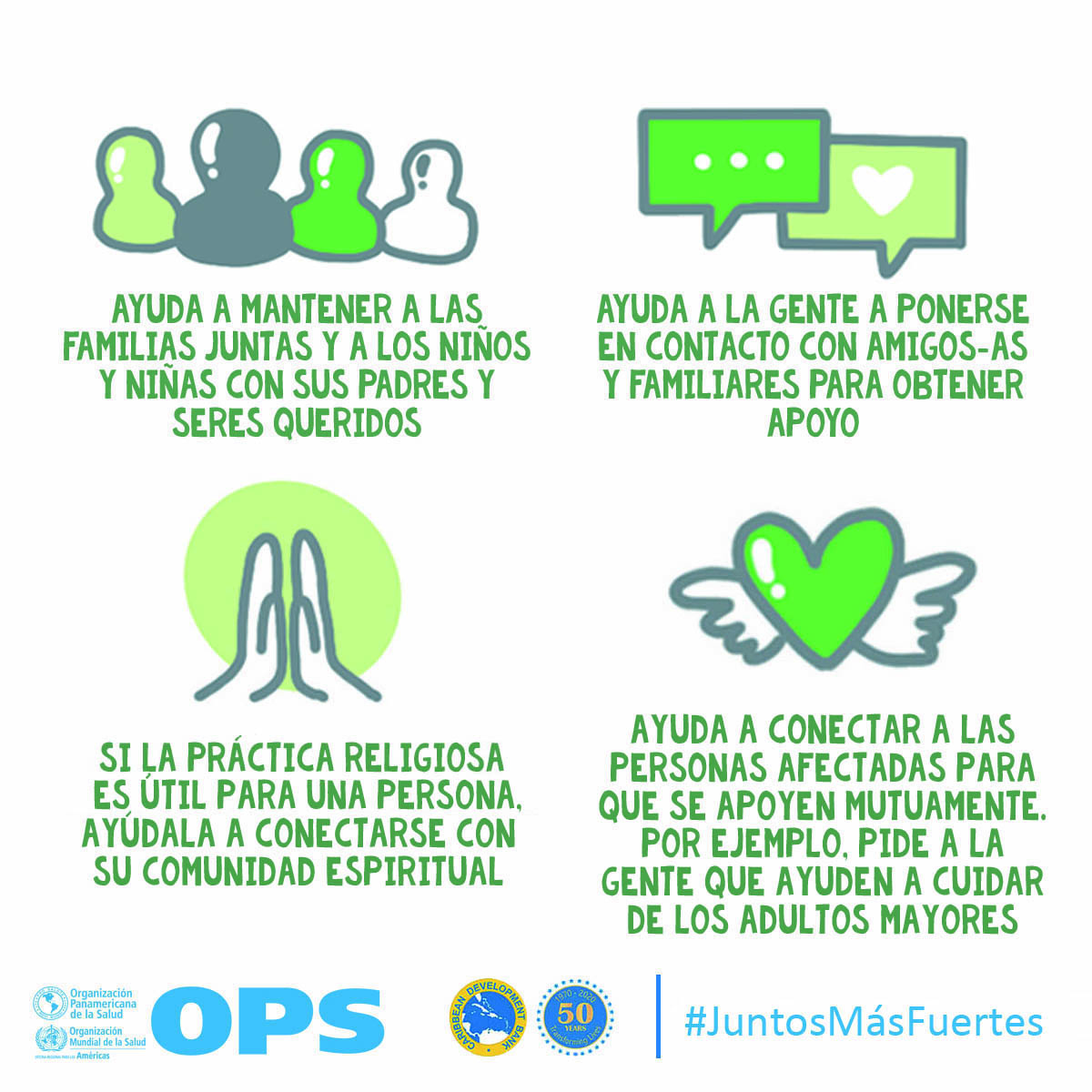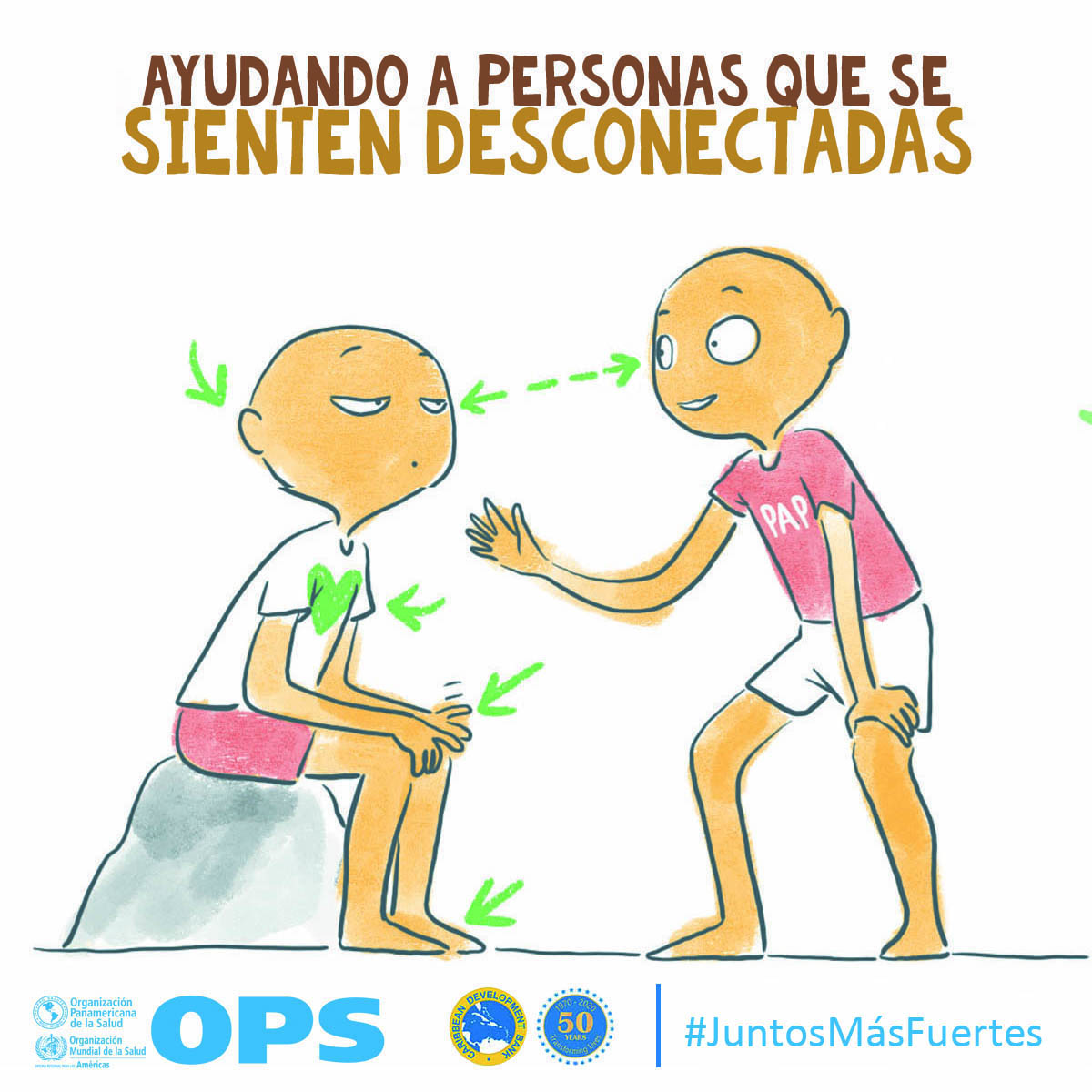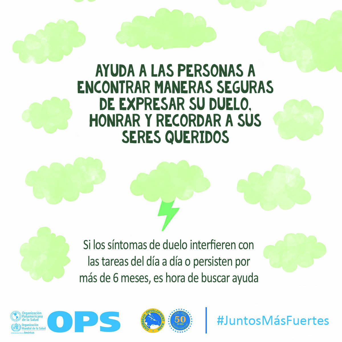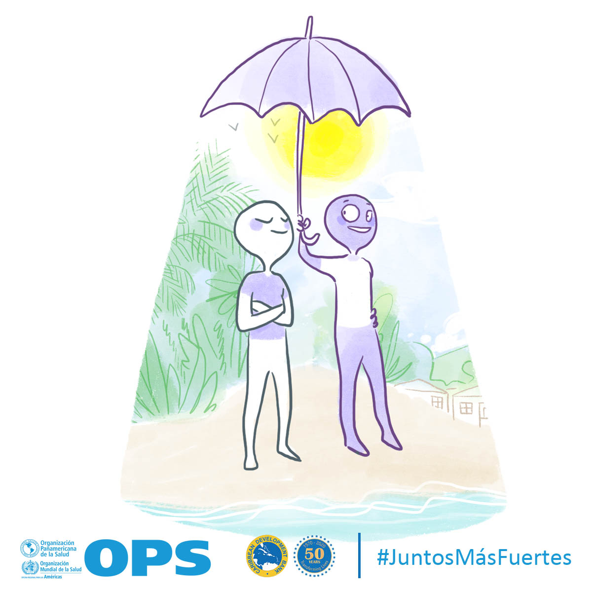 La OPS y el Banco de Desarrollo Caribeño (CBD, por sus siglas en inglés) lanzaron Juntos más fuertes para promover el bienestar mental y estrategias para afrontar el estrés durante la COVID-19 y la temporada de huracanes 2020. La campaña también tiene como objetivo reducir el estigma de buscar atención salud mental y apoyo psicosocial, y busca transmitir los principios básicos de la primera ayuda psicológica (PAP), un modo práctico y humano para ayudar y apoyar a personas en situaciones graves de crisis.