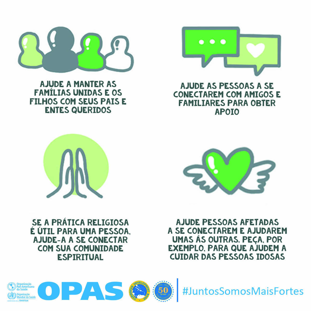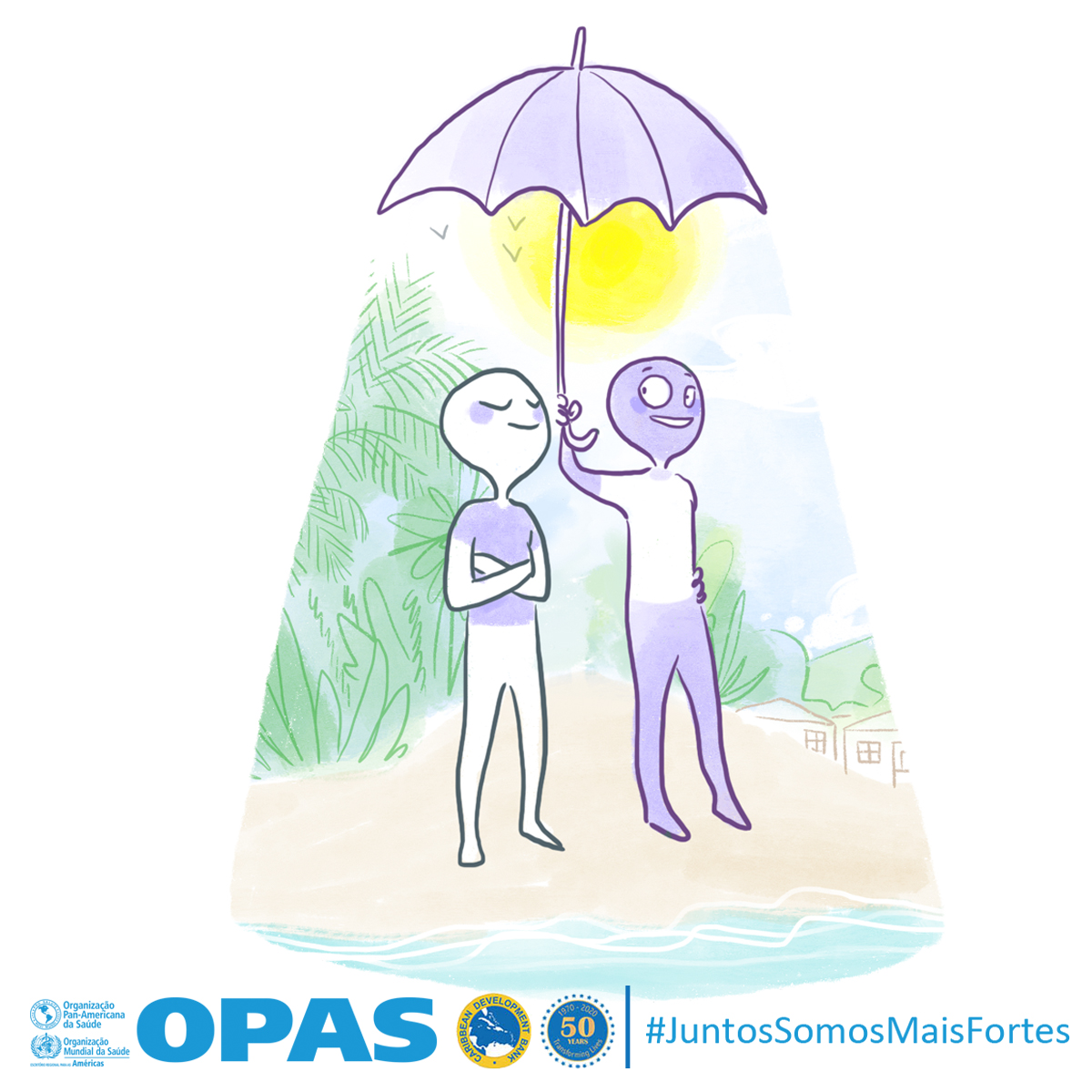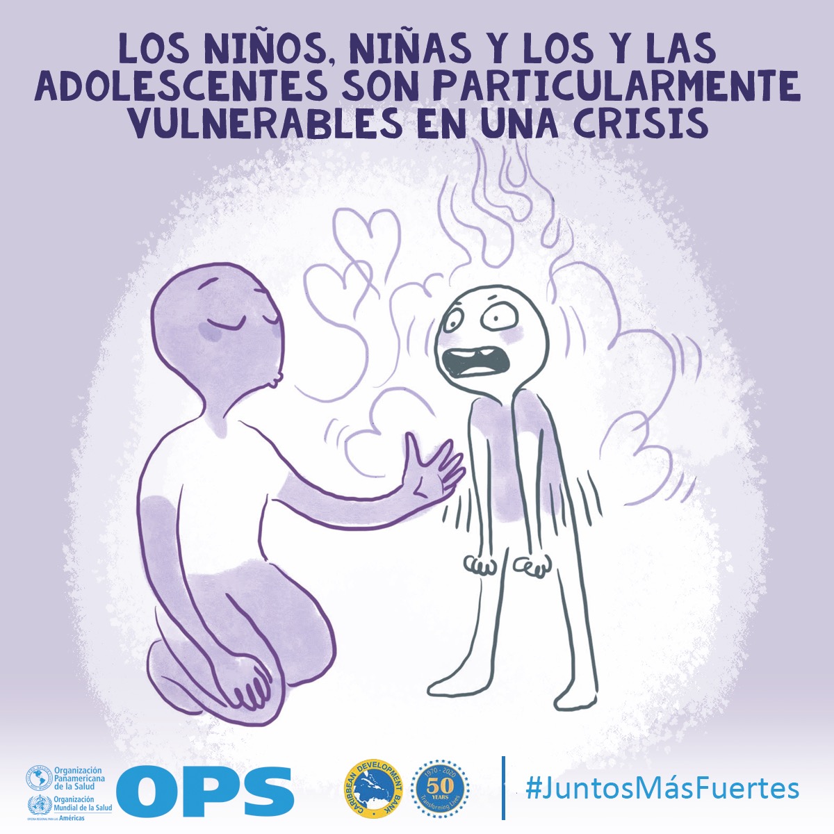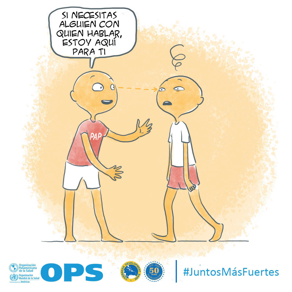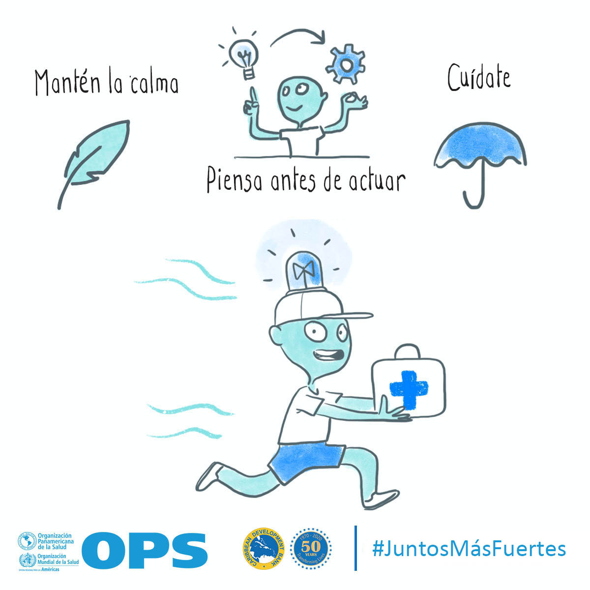 La OPS y el Banco de Desarrollo Caribeño (CBD, por sus siglas en inglés) lanzaron Juntos más fuertes para promover el bienestar mental y estrategias para afrontar el estrés durante la COVID-19 y la temporada de huracanes 2020. La campaña también tiene como objetivo reducir el estigma de buscar atención salud mental y apoyo psicosocial, y busca transmitir los principios básicos de la primera ayuda psicológica (PAP), un modo práctico y humano para ayudar y apoyar a personas en situaciones graves de crisis.