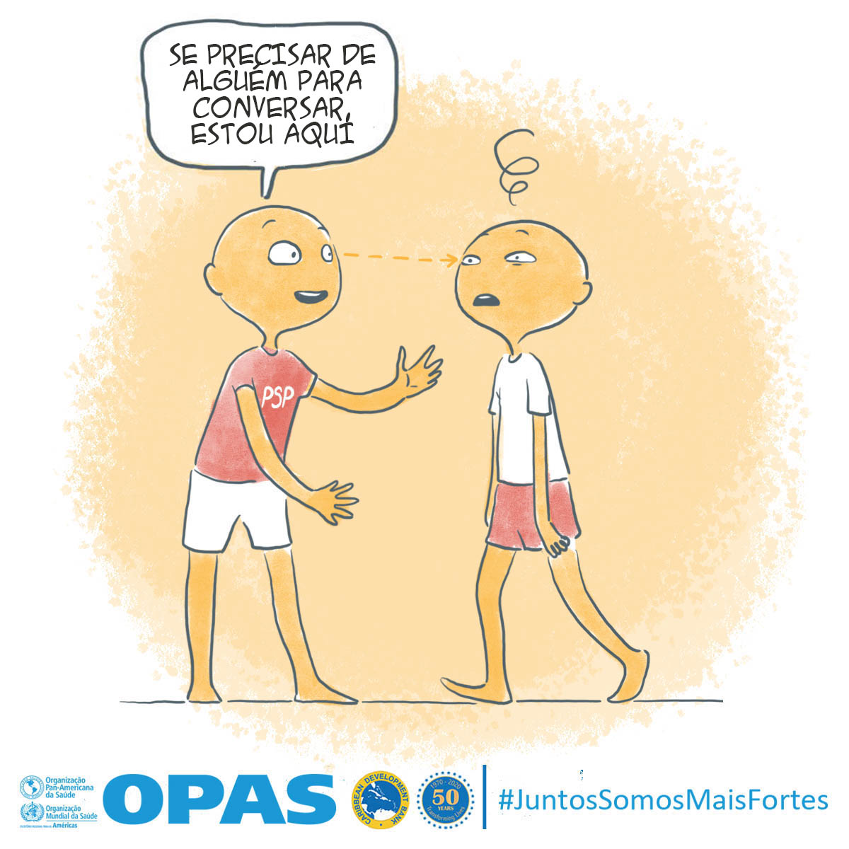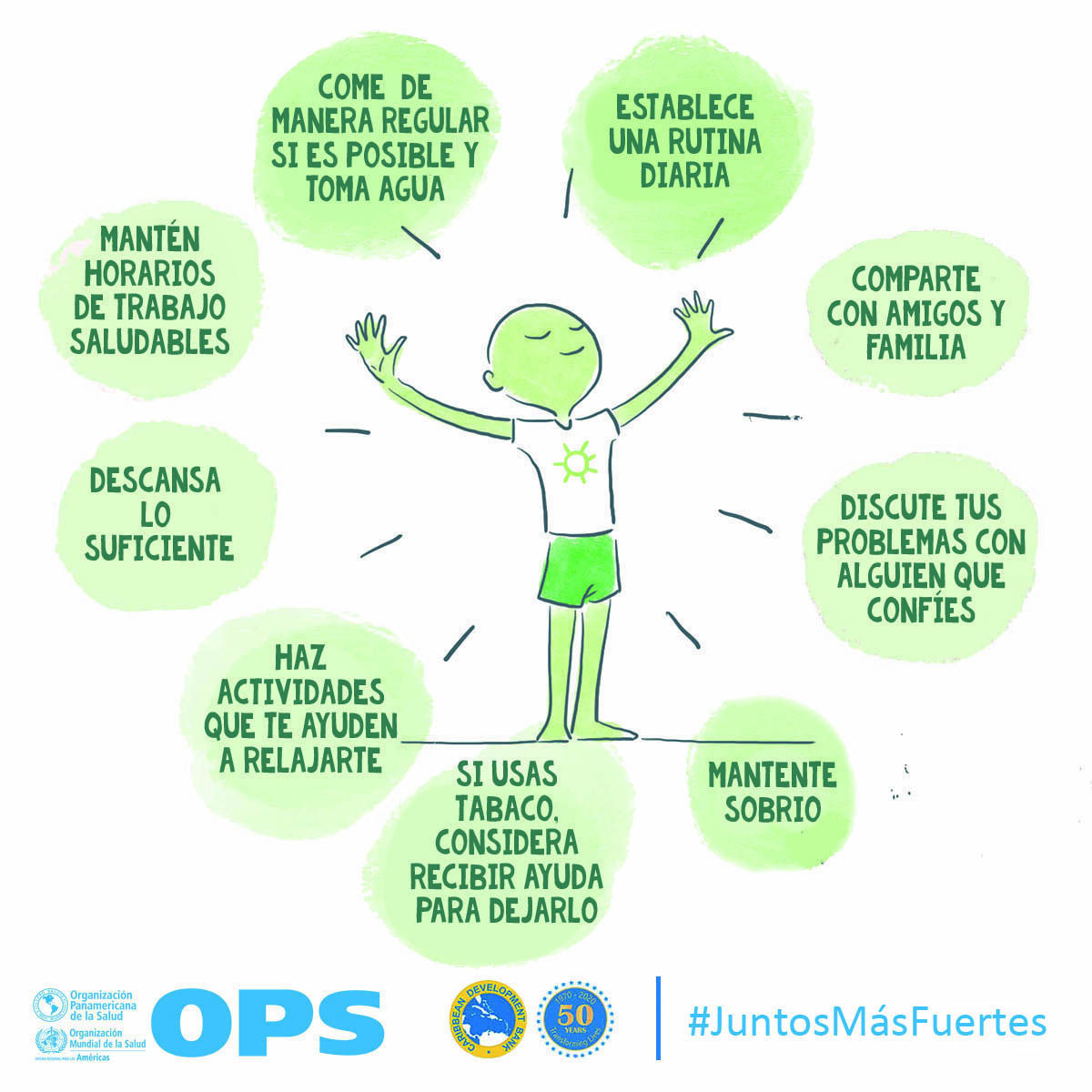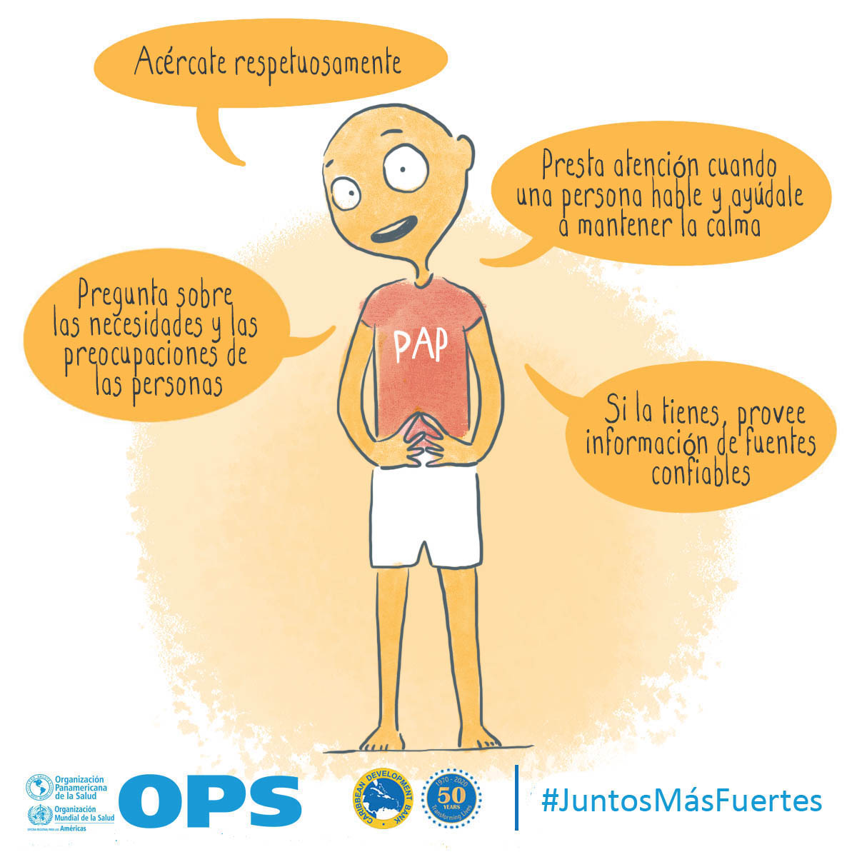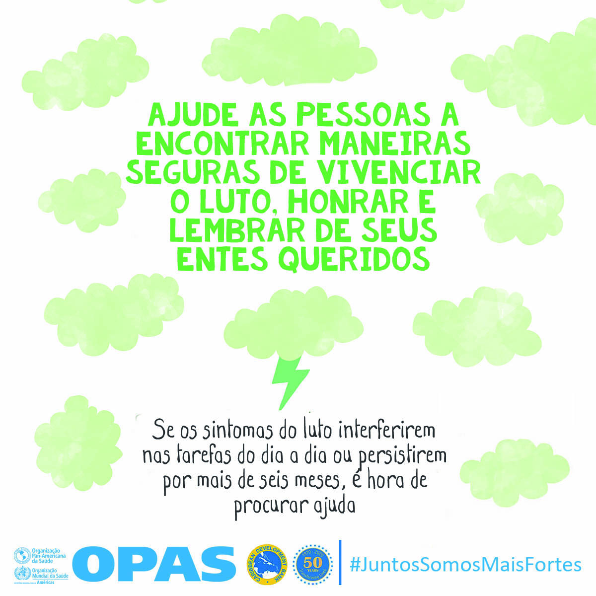 La OPS y el Banco de Desarrollo Caribeño (CBD, por sus siglas en inglés) lanzaron Juntos más fuertes para promover el bienestar mental y estrategias para afrontar el estrés durante la COVID-19 y la temporada de huracanes 2020. La campaña también tiene como objetivo reducir el estigma de buscar atención salud mental y apoyo psicosocial, y busca transmitir los principios básicos de la primera ayuda psicológica (PAP), un modo práctico y humano para ayudar y apoyar a personas en situaciones graves de crisis.