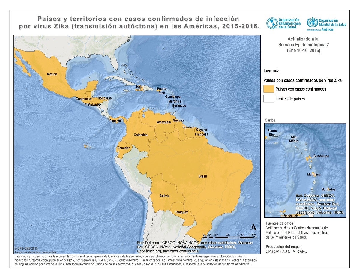 Países y territorios con transmisión autóctona de virus del zika. Semana Epidemiológica 2 - 2016
