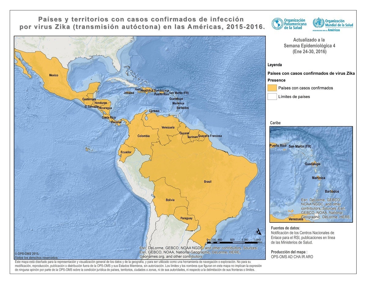 Países y territorios con transmisión autóctona de virus del zika. Semana Epidemiológica 4 - 2016