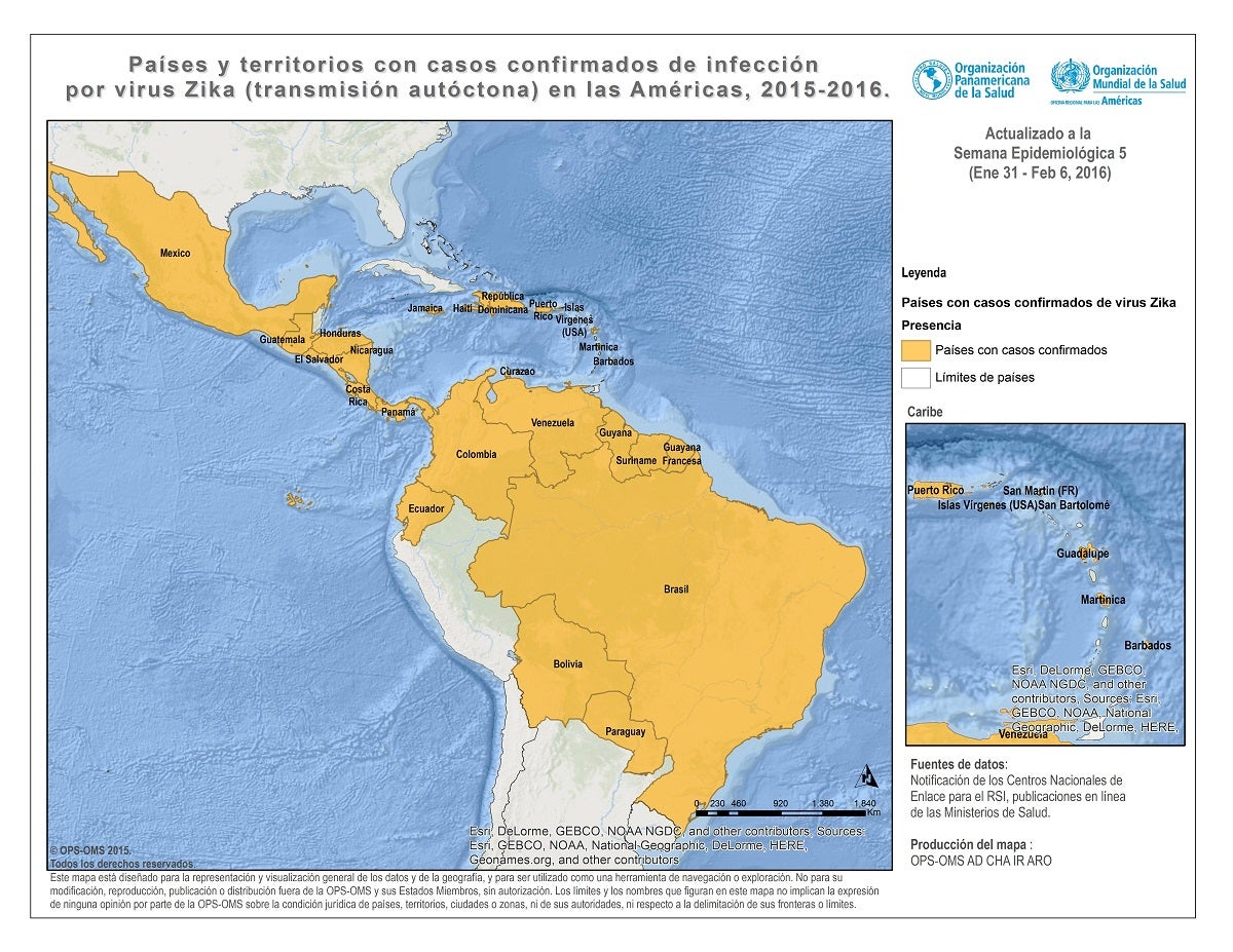 Países y territorios con transmisión autóctona del virus del zika. Semana Epidemiológica 5 - 2016