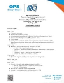 Agenda: Reunión Regional Órgano de Negociación Intergubernamental (INB) y Enmiendas al Reglamento Sanitario Internacional (WGIHR). 10 - 12 de julio del 2023. Washington, D.C.