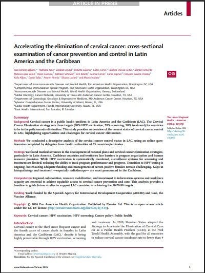SummaryBackgroundCervical cancer is a public health problem in Latin America and the Caribbean (LAC). The Cervical Cancer Elimination strategy sets three targets (90% HPV vaccination, 70% screening, 90% treatment) for countries to be in the path towards elimination. This study provides an overview of the current status of cervical cancer control in LAC, highlighting opportunities and challenges for cervical cancer elimination. MethodsWe conducted a descriptive analysis of the cervical cancer control status in LAC, using an online questionnaire completed by delegates from health authorities of 35 countries/territories. FindingsWe found marked advances in the development of national plans and cervical cancer elimination strategies, particularly in Latin America. Caribbean countries and territories face barriers in program organization and human resource provision. While HPV vaccination is systematically monitored, surveillance systems for screening and treatment are limited, reducing the ability to track program performance and progress. Transition to HPV testing is ongoing, but ensuring adequate funding and management of screen-positive females remain challenging. Gaps in histopathology and treatment —especially radiotherapy— are most pronounced in the Caribbean. InterpretationRegional collaboration, resource mobilization, and investment in information systems and workforce capacity are essential to achieve equitable access to cervical cancer prevention and care. This analysis provides a baseline to guide future studies to support LAC countries in achieving the 90-70-90 targets. FundingWork funded by the Spanish Agency for International Development Cooperation (AECID) and Gavi, the Vaccine Alliance. |