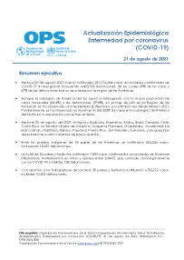Hasta el 20 de agosto 2021, fueron notificados 210.112.064 casos acumulados confirmados de COVID-19 a nivel global, incluyendo 4.403.765 defunciones, de los cuales 39% de los casos y 47% de las defunciones fueron aportadas por la región de las Américas.