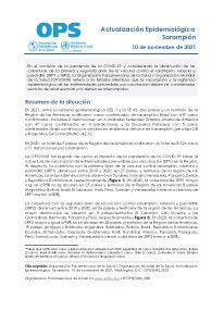 En 2021, entre la semana epidemiológica (SE) 1 y la SE 43, dos países y un territorio de la Región de las Américas notificaron casos confirmados de sarampión: Brasil con 619 casos confirmados, incluidas 2 defunciones, en 6 unidades federales; Estados Unidos de América con 47 casos confirmados en 4 jurisdicciones y la Guayana Francesa con 5 casos confirmados. Brasil continua con circulación endémica del virus del sarampión, genotipo D8 y linaje MVs/Gir Somnath.IND /42.16.