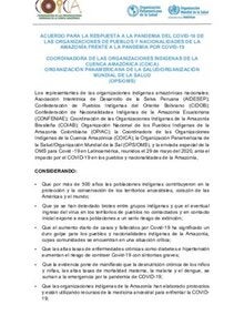 Acuerdo para la respuesta a la pandemia del COVID-19 de las organizaciones de pueblos y nacionalidades de la Amazonía frente a la pandemia por COVID-19, Coordinadora de las Organizaciones Indígenas de la Cuenca Amazónica (COICA) y Organización Panamericana de la Salud/Organización Mundial de la Salud (OPS/OMS).