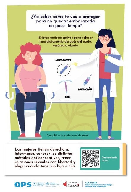 Afiche para promover la Anticoncepción Inmediata Post Evento Obstétrico (AIPEO), que destaca la importancia del diálogo sobre el tema entre pacientes y profesionales de la salud. Las mujeres tienen derecho a informarse, conocer los distintos métodos anticonceptivos, tener relaciones sexuales con libertad y elegir cuándo tener un hijo o hija. Este material fue elaborado gracias al apoyo de Asuntos Globales Canadá, a través del proyecto Mejorando la salud de las mujeres y las adolescentes en situaciones de vulnerabilidad. |