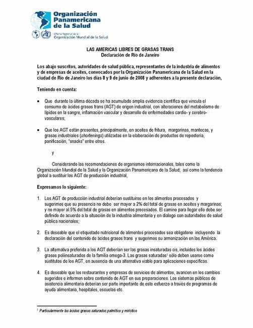 Los abajo suscritos, autoridades de salud pública, representantes de la industria de alimentos y de empresas de aceites, convocados por la Organización Panamericana de la Salud en la ciudad de Río de Janeiro los días 8 y 9 de junio de 2008