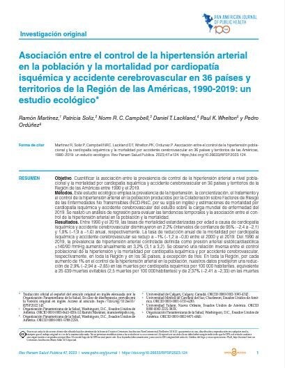 Objetivo. Cuantificar la asociación entre la prevalencia de control de la hipertensión arterial a nivel poblacional y la mortalidad por cardiopatía isquémica y accidente cerebrovascular en 36 países y territorios de la Región de las Américas entre 1990 y el 2019. Métodos. Este estudio ecológico emplea la prevalencia de la hipertensión, la concientización, el tratamiento y el control de la hipertensión arterial en la población producidos por la Colaboración sobre Factores de Riesgo de las Enfermedades No Transmisibles (NCD-RisC, por su sigla en inglés) y estimaciones de mortalidad por cardiopatía isquémica y accidente cerebrovascular del estudio sobre la carga mundial de enfermedad del 2019. Se realizó un análisis de regresión para evaluar las tendencias temporales y la asociación entre el con- trol de la hipertensión arterial en la población y la mortalidad. Resultados. Entre 1990 y el 2019, las tasas de mortalidad estandarizadas por edad a causa de cardiopatía isquémica y accidente cerebrovascular disminuyeron en 2,2% (intervalos de confianza de 95%: –2,4 a –2,1) y 1,8% (–1,9 a –1,6) anual, respectivamente. La tasa de reducción anual de la mortalidad por cardiopatía isquémica y accidente cerebrovascular se redujo a –1% (–1,2 a –0,8) entre el 2000 y el 2019. Del 1990 al 2019, la prevalencia de hipertensión arterial controlada definida como presión arterial sistólica/diastólica ≤140/90 mmHg aumentó anualmente en 3,2% (3,1 a 3,2). Se observó una relación inversa entre el control poblacional de la hipertensión y la mortalidad por cardiopatía isquémica y por accidente cerebrovascular, respectivamente, en toda la Región y en los 36 países, a excepción de tres. En toda la Región, por cada aumento de 1% en el control de la hipertensión arterial en la población, nuestros datos predijeron una reduc- ción de 2,9% (–2,94 a –2,85) en las muertes por cardiopatía isquémica por 100 000 habitantes, equivalente a 25 639 muertes evitables (2,5 muertes por 100 000 habitantes) y de 2,37% (–2,41 a –2,33) en las muertes por accidente cerebrovascular por 100000 habitantes, equivalente a 9 650 muertes evitables (una muerte por 100 000 habitantes). Conclusiones. Existe una sólida asociación ecológica negativa entre la mortalidad por cardiopatía isquémica y accidente cerebrovascular y el control de la hipertensión arterial en la población. Los países con mejor resultado en el control de la hipertensión mostraron un mayor progreso en la reducción de la mortalidad por enfermedad cardiovascular. Los modelos de predicción tienen implicaciones en el manejo de la hipertensión en la mayoría de los grupos poblacionales de la Región de las Américas y otras partes del mundo.