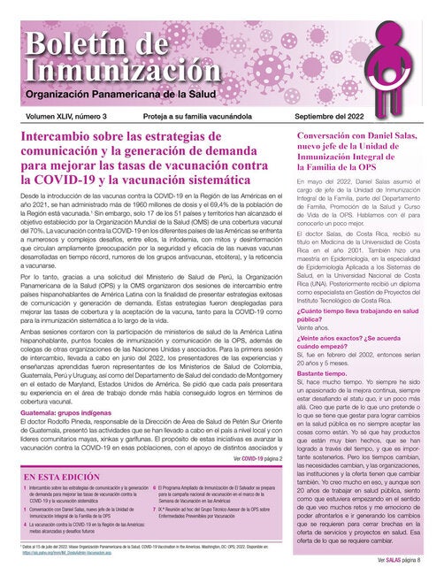 EN ESTA EDICIÓN: Intercambio sobre las estrategias de comunicación y la generación de demanda para mejorar las tasas de vacunación contra la COVID-19 y la vacunación sistemática | Conversación con Daniel Salas, nuevo jefe de la Unidad de Inmunización Integral de la Familia de la OPS | La vacunación contra la COVID-19 en la Región de las Américas: metas alcanzadas y desafíos futuros | El Programa Ampliado de Inmunización de El Salvador se prepara para la campaña nacional de vacunación en el marco de la Semana de Vacunación en las Américas | IX.ª Reunión ad hoc del Grupo Técnico Asesor de la OPS sobre Enfermedades Prevenibles por Vacunación.