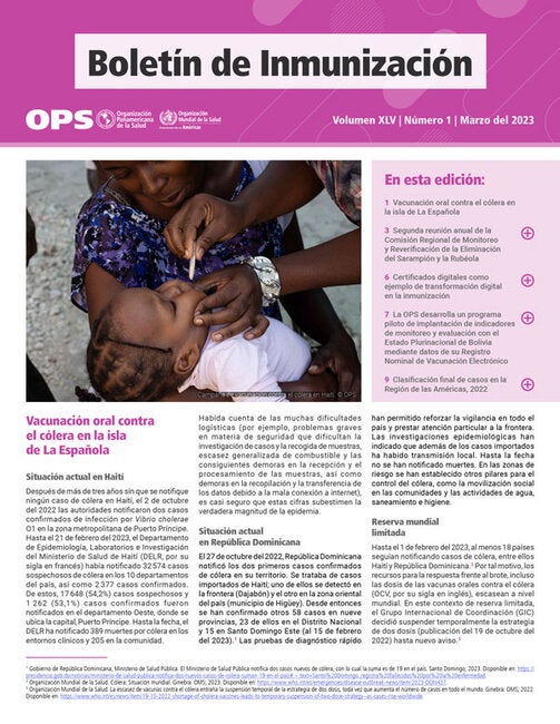 EN ESTA EDICIÓN: Vacunación oral contra el cólera en la isla de La Española | Segunda reunión anual de la Comisión Regional de Monitoreo y Reverificación de la Eliminación del Sarampión y la Rubéola | Certificados digitales como ejemplo de transformación digital en la inmunización | La OPS desarrolla un programa piloto de implantación de indicadores de monitoreo y evaluación con el Estado Plurinacional de Bolivia mediante datos de su Registro Nominal de Vacunación Electrónico | Clasificación final de casos en la Región de las Américas, 2022.