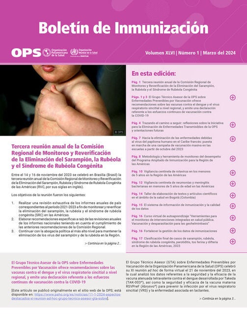 La Organización Panamericana de la Salud (OPS) publica cuatro veces al año el Boletín de Inmunización en español, francés, inglés y portugués. Su propósito es facilitar el intercambio de ideas e información sobre los programas de inmunización en la Región de las Américas y más allá. Se publica desde 1979 en inglés y español, con versiones en francés y portugués a partir de 2001 y 2019, respectivamente. El número de marzo del 2024 del Boletín de Inmunización abarca los siguientes temas: Tercera reunión anual de la Comisión Regional de Monitoreo y Reverificación de la Eliminación del Sarampión, la Rubéola y el Síndrome de Rubeola Congénita; El Grupo Técnico Asesor de la OPS sobre Enfermedades Prevenibles por Vacunación ofrece recomendaciones sobre las vacunas contra el dengue y el virus respiratorio sincitial a nivel regional y emite una declaración referente a los esfuerzos continuos de vacunación contra la COVID-19; Trazando el camino a seguir: reflexiones sobre la Iniciativa para la Eliminación de Enfermedades Transmisibles de la OPS y orientaciones futuras; Hacia la eliminación de las enfermedades debidas al virus del papiloma humano en el Caribe francés: puesta en marcha de una campaña de vacunación masiva en las escuelas a partir de octubre del 2023; Metodología y herramienta de monitoreo del desempeño del Program Ampliado de Inmunización para la Región de las Américas; Vigilancia centinela de rotavirus en los menores de 5 años en la Región de las Américas; Vigilancia centinela de neumonías y meningitis bacterianas en menores de 5 años de edad en las Américas; Taller de Elaboración de textos y artículos científicos en el ámbito de la salud en Bogotá (Colombia); Clasificación final de casos en la Región de las Américas, 2022; El sistema de información de inmunización y la calidad de los datos; Curso virtual de autoaprendizaje “Herramientas para el monitoreo de intervenciones integradas en salud pública. Vacunación y desparasitación para las geohelmintiasis”; y Fortalecer la gestión de los datos de inmunizaciones. |