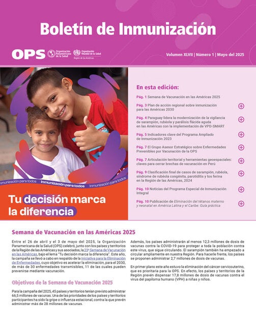 La Organización Panamericana de la Salud (OPS) publica cuatro veces al año el Boletín de Inmunización en español, francés, inglés y portugués. Su propósito es facilitar el intercambio de ideas e información sobre los programas de inmunización en la Región de las Américas y más allá. Las versiones en inglés y español se vienen publicando desde 1979, mientras que aquellas en francés y portugués comenzaron a salir a partir del 2001 y el 2019, respectivamente. La edición de mayo del 2025 del Boletín de Inmunización incluye un artículo que presenta el Plan de acción regional sobre inmunización para las Américas 2030 (RIAP2030), que es el resultado del trabajo conjunto con los países y territorios de la Región de las Américas y está alineado con el documento estratégico Revitalizar la inmunización como un bien público para la salud universal y la Agenda de Inmunización 2030 (IA2030); un artículo sobre Paraguay, país que lidera la modernización de la vigilancia del sarampión, la rubéola y la parálisis flácida aguda en las Américas a través de la implementación de VPD-SMART; una infografía sobre algunos indicadores del formulario para la notificación conjunta sobre inmunización (JRF) de la OPS/OMS y UNICEF, una herramienta clave para proporcionar una visión amplia y completa del impacto, el alcance y las brechas del Programa Ampliado de Inmunización (PAI) en los países y territorios de la Región de las Américas, y un resumen sobre el nuevo Grupo Asesor Estratégico sobre Enfermedades Prevenibles por Vacunación de la OPS. Asimismo, se incluyen detalles de la coordinación territorial y herramientas geoespaciales que son claves para el cierre de las brechas de vacunación en Perú, y datos para que los equipos de salud cuenten con información precisa y actualizada para el diseño, la implementación y el monitoreo de acciones esenciales en los territorios, además de un cuadro visual de datos de casos de enfermedades prevenibles por vacunación para el año 2024.