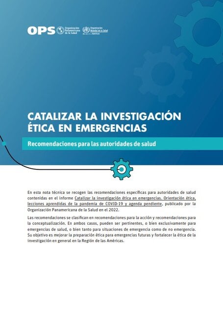 En esta nota técnica se recogen las recomendaciones para las autoridades de salud incluidas en la publicación de la Organización Panamericana de la Salud Catalizar la investigación ética en emergencias. Orientación ética, lecciones aprendidas de la pandemia de COVID-19 y agenda pendiente, que ofrece orientaciones para presentar estrategias y pautas sobre la modificación de los procesos de supervisión ética en situaciones de emergencia, monitorear de forma ética las investigaciones en curso ante el surgimiento de nueva evidencia y superar otros desafíos éticos que se planteen al hacer investigaciones en emergencias de salud pública. Asimismo, brinda orientación para que el uso de emergencia de intervenciones no probadas y fuera de un ámbito de investigación se lleve a cabo de manera ética. Por último, incluye las lecciones aprendidas en la Región de las Américas durante la pandemia de COVID-19 y recomendaciones resultantes de un ejercicio de reflexión regional dirigido a mejorar la preparación ética para realizar investigaciones en el transcurso de emergencias de salud futuras.