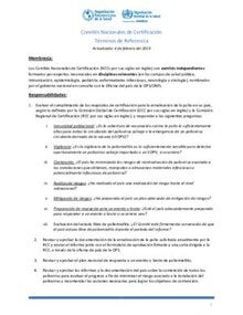 National Certification Committees (NCCs) are independent committees made up of leading experts in relevant disciplines (in the fields of public health, immunization, epidemiology, pediatrics, infectious diseases, neurology and virology), appointed by the national government in consultation with the PAHO/WHO Regional Office. |