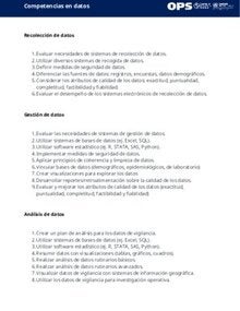 Las competencias básicas son combinaciones de “requisitos previos” mínimos en términos de conocimientos, habilidades y capacidades que los profesionales deben adquirir para desempeñar su trabajo de manera efectiva. Desarrollar un currículo regional de fortalecimiento de capacidades basado en un conjunto de competencias básicas definidas contribuye a armonizar las prácticas de gestión, análisis e interpretación de datos de vigilancia de virus respiratorios en los Estados Miembros de las Américas. Las competencias básicas están agrupadas en cinco componentes relacionados con los datos de vigilancia de virus respiratorios: recolección, gestión, análisis, interpretación y comunicación. |