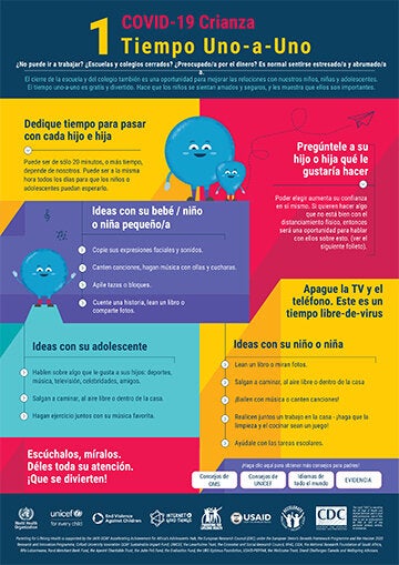 Para ayudar a los padres a interactuar de manera constructiva con sus hijos durante este período de reclusión, estos seis consejos de una página para padres cubren la planificación individual, mantenerse positivo, crear una rutina diaria, evitar el mal comportamiento, controlar el estrés y hablar sobre COVID -19. Úselos para su ventaja y la de sus hijos, y diviértase haciéndolo. Enlace a recursos. |