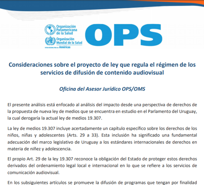 La ley de medios 19.307 incluye acertadamente un capítulo específico sobre los derechos de los niños, niñas y adolescentes (Arts. 29 a 33). Esta inclusión ha significado una fundamental adecuación del marco legislativo de Uruguay a los estándares internacionales de derechos en materia de niñez y adolescencia.