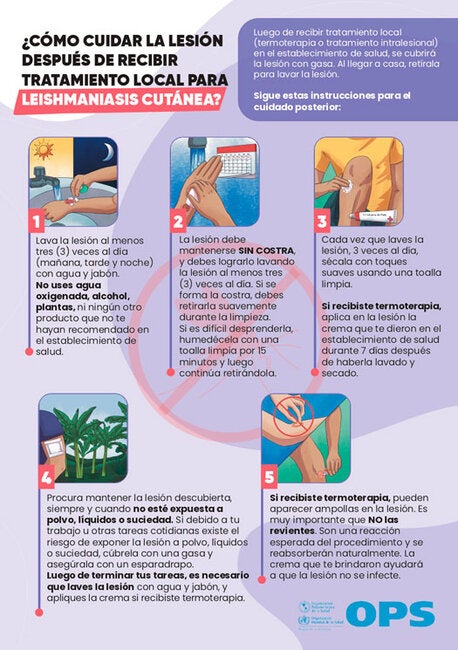 Esta es una guía con el paso a paso que deben seguir los pacientes que han recibido tratamiento local (termoterapia o terapia intralesional) para leishmaniasis cutánea no complicada, con la finalidad de prevenir complicaciones y favorecer la evolución de la lesión. |