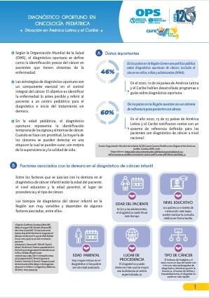 Las estrategias de diagnóstico oportuno son un componente esencial en el control integral del cáncer infantil. El objetivo es identificar la enfermedad lo antes posible y referir al paciente a un centro pediátrico para el diagnóstico e inicio del tratamiento sin demora. Cuando se hace con prontitud, la mayoría de los cánceres se pueden detectar en una etapa en la cual se pueden curar, con mejora de la supervivencia y la calidad de vida. En esta publicación se aborda el panorama actual sobre el diagnóstico oportuno del cáncer infantil y las oportunidades de mejora.
