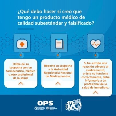 Diapositiva para redes sociales - ¿Qué debo hacer si creo que tengo un producto medico de calidad subestandar y falsificado? Más información:Toolkit - Vigilancia y Control de Mercado de Productos Médicos Subestándar y Falsificados |