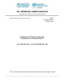 De conformidad con el párrafo 14.9 del Reglamento Financiero de la Organización Panamericana de la Salud (OPS), tengo el honor de presentar el Informe Financiero de la Organización Panamericana de la Salud correspondiente al período de presentación de información financiera comprendido entre el 1 de enero y el 31 de diciembre del 2018. Los estados financieros y las notas a los estados financieros se han preparado de acuerdo con lo estipulado en las Normas Internacionales de Contabilidad del Sector Público (IPSAS) y el Reglamento Financiero y Reglas Financieras de la OPS. Aunque la OPS ha adoptado un período anual de presentación de informes financieros según lo estipulado en el párrafo 2.2 del Reglamento Financiero, el período presupuestario sigue siendo de un bienio (párrafo 2.1 del Reglamento Financiero). Por consiguiente, para fines de comparación entre los importes reales y las cifras presupuestarias, en los Comentarios de la Directora, las cifras del presupuesto anual representan la mitad del Programa y Presupuesto bienal como una aproximación de las cifras presupuestarias anuales. 1. Principales |