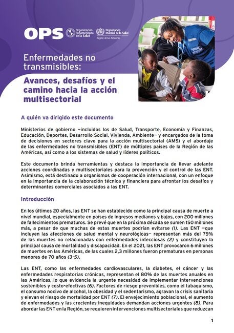 Esta hoja informativa, desarrollada por la Organización Panamericana de la Salud/Organización Mundial de la Salud (OPS/OMS), está dirigida a autoridades nacionales y tomadores de decisiones que lideran la formulación de políticas públicas, así como a los equipos técnicos responsables de su implementación. El documento proporciona una visión clara del rol que desempeña la acción multisectorial como una vía esencial para acelerar los avances hacia la meta 3.4 de los Objetivos de Desarrollo Sostenible: reducir en un tercio la mortalidad prematura por ENT mediante la prevención y el tratamiento, y promover la salud mental y el bienestar. La publicación destaca que las intervenciones costoeficaces recomendadas por la OMS (best buys), como el control del tabaco, la regulación del alcohol, la mejora del entorno alimentario, la promoción de la actividad física, y la gestión de las ENT desde un enfoque de atención primaria mediante tecnologías costoeficientes, entre otras, requieren del esfuerzo conjunto de múltiples sectores —incluidos educación, finanzas, transporte, urbanismo, agricultura, justicia y medios de comunicación— para lograr un impacto significativo a nivel poblacional. Además de presentar los beneficios de este enfoque, se describen los principales facilitadores, barreras y mecanismos de gobernanza necesarios para su implementación, incluyendo experiencias concretas de cooperación técnica en la región. |