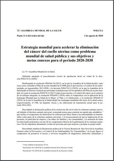 En Agosto de 2020, la Asamblea Mundial de la Salud adoptó la estrategia mundial para acelerar la eliminación del cáncer cervicouterino como un problema de salud pública.