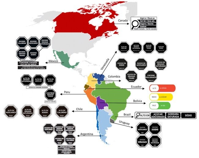 La mala nutrición es una de las principales causas de enfermedades no transmisibles (ENT), especialmenteen la Región de las Américas de la OMS (AMRO). En respuesta, las organizaciones internacionales recomiendan sistemas de etiquetado frontal nutrimental (FOPNL, por su sigla en inglés) que presenten la información nutricional de manera clara para ayudar a los consumidores a tomar decisiones más saludables. En AMRO 35 países han considerado el FOPNL, 30 países han introducido formalmente un FOPNL, once han adoptado un FOPNL y siete países (Argentina, Chile, Ecuador, México, Perú, Uruguay y Venezuela) han implementado un FOPNL. El FOPNL ha expandido y evolucionado adoptando sistemas con sellos de advertencia de mayor tamaño, que usan fondos contrastantes y que utilizan "exceso" en lugar de "alto en" para mejorar su eficacia. Además, adoptaron el Modelo de Perfil de Nutrientes de la OPS para definir mejor los umbrales de nutrientes. La evidencia inicial indica que la implementación ha sido exitosa, así como la disminución en compras de productos con sellos, y mayor reformulación de productos. Los gobiernos que aún están discutiendo implementar un FOPNL deben seguir las mejores prácticas para ayudar a reducir las ENT relacionadas con la mala nutrición.