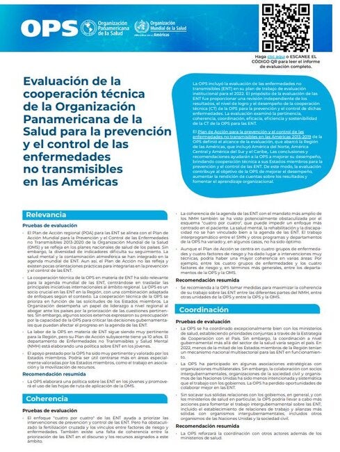 El propósito general de la evaluación fue determinar el nivel de logro de resultados y desempeño para la prevención y el control de las ENT. Los tres objetivos de la evaluación incluían documentar los logros y desafíos clave, examinar los factores habilitantes y limitantes, y brindar lecciones aprendidas y recomendaciones basadas en evidencia. El alcance de la evaluación estuvo determinado por el alcance del POA y cubrió el período de 2013 y la región de las Américas, incluidas las subregiones del Caribe, América Central y América del Sur.