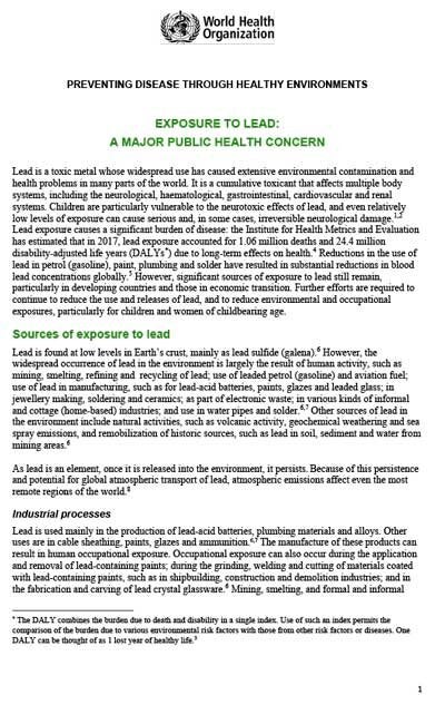 Lead is a toxic metal whose widespread use has caused extensive environmental contamination and health problems in many parts of the world. It is a cumulative toxicant that affects multiple body systems, including the neurological, haematological, gastrointestinal, cardiovascular and renal systems. Children are particularly vulnerable to the neurotoxic effects of lead, and even relatively low levels of exposure can cause serious and, in some cases, irreversible neurological damage.