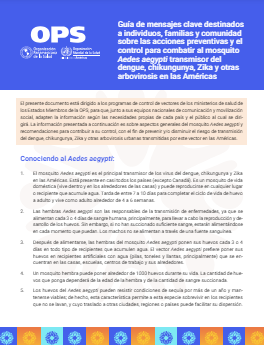 El presente documento está dirigido a los programas de control de vectores de los ministerios de salud de los Estados Miembros de la OPS, para que, junto a sus equipos nacionales de comunicación y movilización social, adapten la información según las necesidades propias de cada país y el público al cual se dirigirá. La información presentada a continuación es sobre aspectos generales del mosquito Aedes aegypti y recomendaciones para contribuir a su control, con el fin de prevenir y/o disminuir el riesgo de transmisión del dengue, chikungunya, zika y otras arbovirosis urbanas transmitidas por este vector en las Américas. |