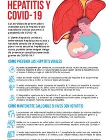 Los servicios de prevención y atención para la hepatitis son esenciales incluso durante la pandemia de COVID-19. Si tienes hepatitis crónica y enfermedad hepática avanzada o has sido curado de la hepatitis C pero tienes secuelas hepáticas en curso, puedes tener mayor riesgo de presentar complicaciones más graves de COVID-19. |