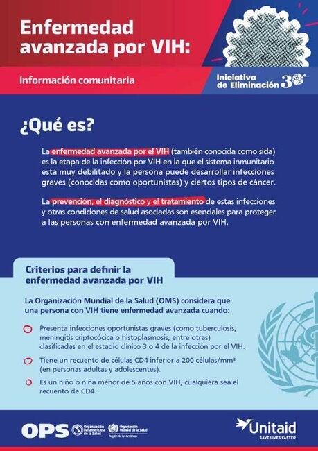 La Hoja Informativa sobre enfermedad avanzada por VIH es un recurso esencial para comprender y reconocer esta etapa de la infección. Su propósito es ofrecer información clara, basada en evidencia y accesible para profesionales de la salud, comunicadores y comunidades. El material destaca los principales signos y síntomas, las causas más frecuentes de enfermedad avanzada y la importancia del diagnóstico oportuno y del acceso continuo al tratamiento antirretroviral. También ayuda a identificar barreras comunes que pueden retrasar la búsqueda de atención y orienta sobre acciones clave para prevenir complicaciones. Esta hoja contribuye a fortalecer las estrategias de comunicación y sensibilización, promoviendo una mayor comprensión pública y apoyando los esfuerzos para reducir la morbilidad y mortalidad asociadas al VIH. |