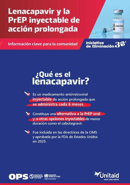 La Hoja Informativa sobre Lenacapavir y la PrEP inyectable de acción prolongada ofrece una visión clara y actualizada sobre esta nueva herramienta de prevención del VIH. Su objetivo es explicar de manera sencilla cómo funciona este medicamento, quiénes pueden beneficiarse de él y por qué representa un avance importante en la prevención del VIH. El material describe las características clave de Lenacapavir, su administración semestral, y cómo complementa las opciones de PrEP ya existentes, como la PrEP oral diaria y otras formulaciones inyectables. También destaca su reciente inclusión en las directrices de la OMS y su aprobación por la FDA, lo que respalda su eficacia y seguridad. Esta hoja informativa ayuda a profesionales de la salud, comunicadores y comunidades a comprender mejor esta innovación biomédica, fortaleciendo estrategias de prevención y contribuyendo a ampliar el acceso a opciones diversificadas de cuidado. |