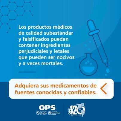 Adquiera sus medicamentos de fuentes conocidad y confiables Más información:Toolkit - Vigilancia y Control de Mercado de Productos Médicos Subestándar y Falsificados |