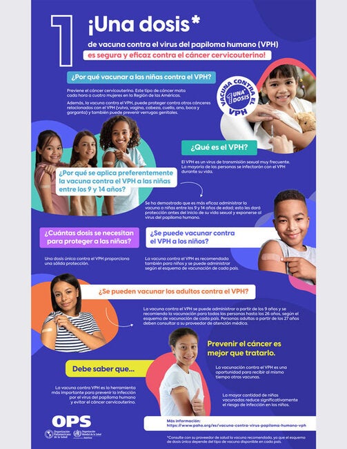 Esta infografía responde preguntas como: ¿Por qué vacunar a las niñas contra el VPH?, ¿Qué es el VPH?, ¿Por qué se aplica preferentemente la vacuna contra el VPH a las niñas entre los 9 y 14 años?, ¿Cuántas dosis se necesitan para proteger a las niñas?, ¿Se puede vacunar contra el VPH a los niños?, ¿Se pueden vacunar los adultos contra el VPH?
